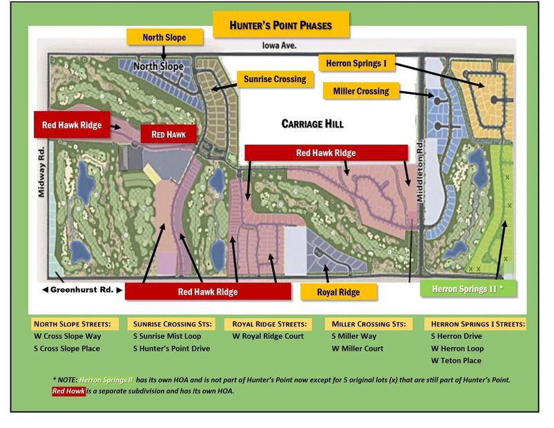 The Hunter's Point community comprises five sections/phases: Herron Springs, Miller Crossing, North Slope, Royal Ridge, and Sunrise Crossing. All five sections are adjacent to portions of the Red Hawk Golf Course (formerly Hunter's Point Golf Course). The Red Hawk comunity is not part of Hunter's Point and has its own HOA.